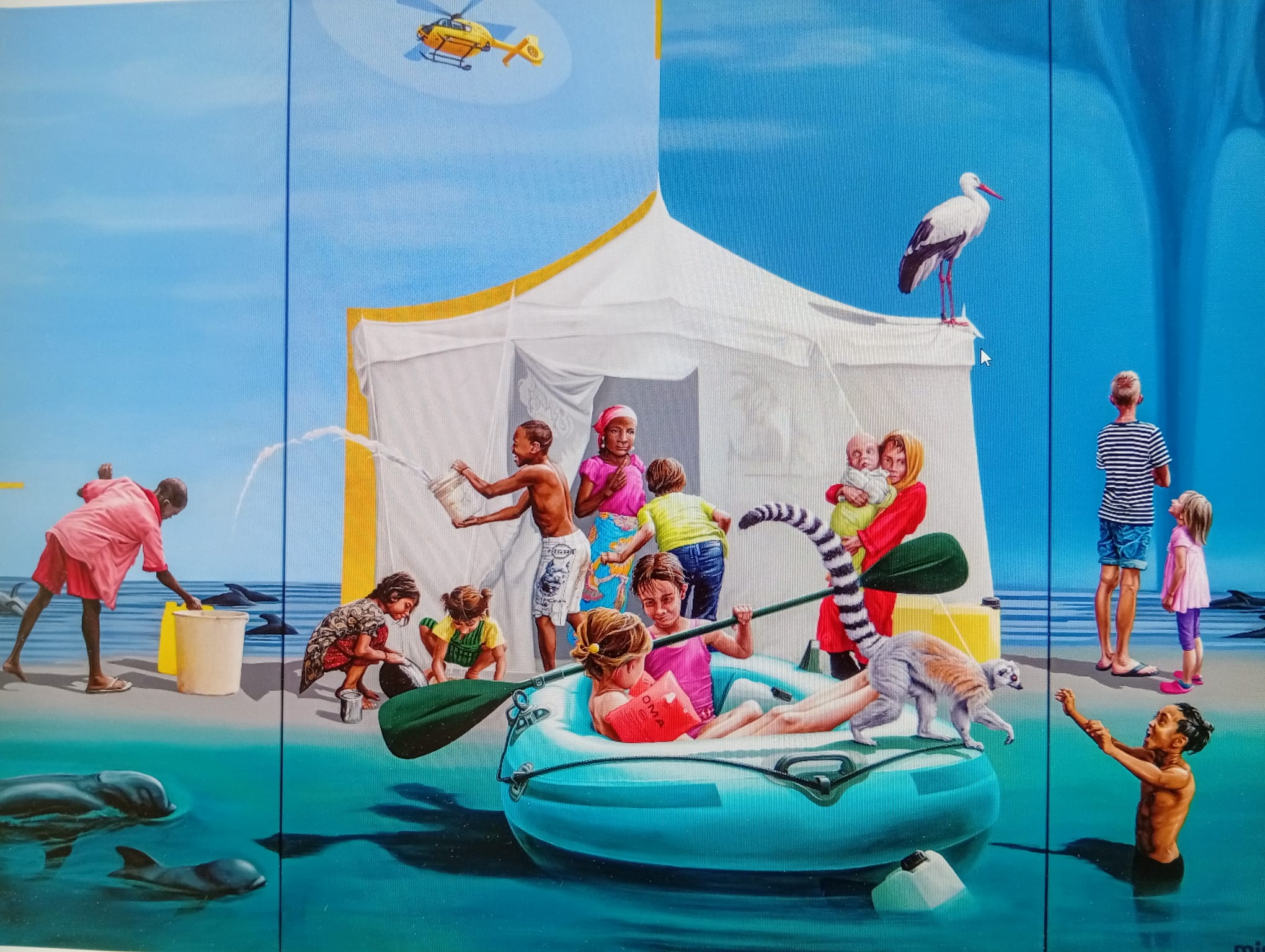 Im 2. Jahr begleitet uns das Hungertuch von Konstanze Trommer: Kinder auf einer flachen Sandbank, von Katastrophen be-droht, auf sich gestellt. Sie leben, was es bedeutet: Wohin gehen wir gemeinsam? Eine Hoffnungsspur Richtung Zukunft!