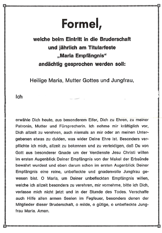 Eine Bruderschaft ist eine kirchliche errichtete Körperschaft, die je nach Ausrichtung verschiedenen Personenkreisen offenstehen. Ein Hauptanliegen ist das religiöse Totengedenken. Dazu treten weitere Ziele (Caritas, Förderung individueller Frömmigkeit). Bruderschaften stehen unter dem Patronat eines Heiligen oder einer Heilstatsache. Im Burghagel steht diese Bruderschaft unter dem Patronat „Maria Empfängnis“. Die hier angefügte Formel wird beim Eintritt in die Bruderschaft und jährlich am Titularfest „Maria Empfängnis“ am 08. Dezember gesprochen.