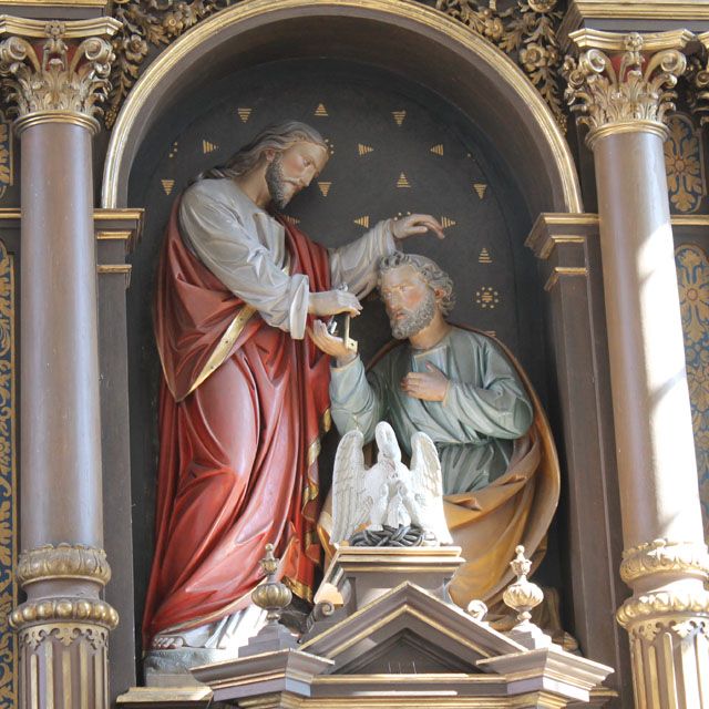 Das Hochfest zum heiligen Petrus feiert die Kirche zusammen mit dem heiligen Paulus am 29. Juni. Ursprünglich aus Bethsaida, lebte Petrus als Fischer mit seiner Familie in Kafarnaum, als Jesus, der ihm den Beinamen Kephas [Griech,: Petrus = Fels] verlieh, ihn und seinen Bruder Andreas als Jünger berief. Petrus war mit Johannes und Jakobus Zeuge der Auferweckung der Tochter Jairus, der Verklärung auf dem Berge und der Todesangst Jesu.